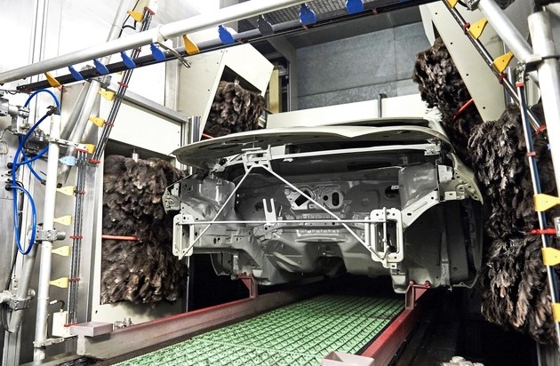 Nach der Straußenfeder-"Waschanlage" folgt der innovative Lackierprozess mit Grundierung, Farb- und Klarlackauftrag. Der Wegfall der Ofentrocknung zwischen diesen Lackschichten hat zu einer Reduzierung der CO2-Emissionen um geschätzte 15 bis 25 Prozent geführt. Die korrosionsbeständige Schutzbeschichtung und die wasserdichte Versiegelung werden anschließend bei 180 °C getrocknet.