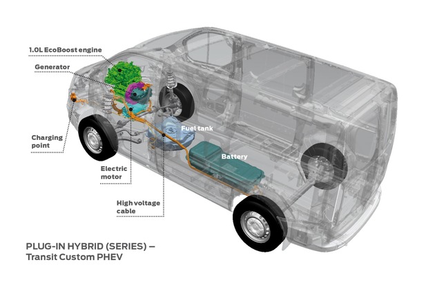 Ford bietet in Europa als erster führender Hersteller von leichten Nutzfahrzeugen eine Plug-In Hybrid-Variante in diesem Segment. Die Technologie ermöglicht es, dass das Fahrzeug mit Netzstrom für lokal emissionsfreie Fahrten betrieben wird, während der EcoBoost-Motor bei Bedarf zusätzlichen Strom für die Batterien erzeugt. Der Ford Transit Custom PHEV nutzt eine serielle Hybrid-Antriebsstrang-Konfiguration, wobei die Räder des Fahrzeugs ausschließlich durch einen Elektromotor anstatt durch den Verbrennungsmotor angetrieben werden.