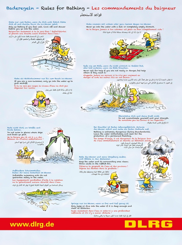 Die DLRG hat die Baderegeln in mehr als 20 Sprachen übersetzt, druckfähige Vorlagen für Flyer und Plakate auch Piktogramme mit Warn- und Sicherheitshinweisen finden Sie hier: http://k.dlrg.de/regeln