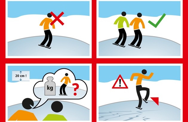 Die Rettungsschwimmer der DLRG leisten jährlich rund 150.000 Stunden Rettungsdienst im Winter und kennen die Tücken der eisigen Idylle. Grundsätzlich sollten sich Wintersportler nur an bewachten Gewässern und nie alleine auf das Eis wagen sowie auf Warnungen in lokalen und regionalen Medien achten.