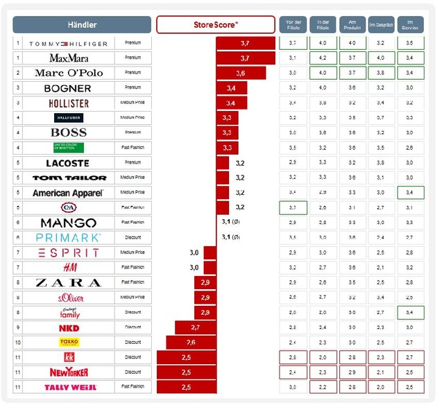 Max Mara und Tommy Hilfiger sind die Gewinner der Studie. Positiv fallen in den Filialen die gepflegten Räumlichkeiten, die großzügige Ausstattung und die hohe Mitarbeiterverfügbarkeit auf. Max Mara ist ein Best-Practice-Beispiel für Kundenorientierung: Mitarbeiter sprechen Kunden proaktiv an und nehmen sich Zeit für fachkompetente Beratung zu Trends, Stoffen, Farben und Modellen. Deutlich aufholen müssen dagegen Händler wie Tally Weijl oder New Yorker. Hier scheinen Ware und Nebentätigkeiten im Vordergrund zu stehen, nicht der Kunde. "Nur wer seine Filialprozesse konsequent auf den Kunden ausrichtet, hat eine Chance. Mitarbeiter müssen entlastet werden und aktiv verkaufen. Unser Ranking zeigt ganz klar auf, wo die Potenziale liegen. Jetzt gilt es, diese kosteneffizient zu heben, um Flächenproduktivität und Kundenerlebnis zu erhöhen", sagt Tobias Göbbel, Managing Partner und Retail Experte bei Batten & Company.