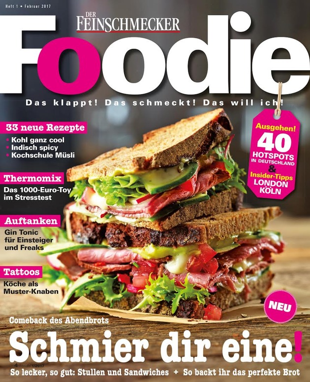 Nach dem erfolgreichen Start von FOODIE, dem jungen Magazin aus der FEINSCHMECKER-Familie, kommt das Magazin mit einem Upgrade: Mehr Themen und Trends, mehr Service und Unterhaltung bietet das aktuelle Heft aus dem Hamburger Jahreszeiten Verlag, das jetzt frisch im Handel ist. Neben den 33 gewohnt machbaren Rezepten - Schwerpunkt: das Comeback des Abendbrots - bieten die Macher des Heftes der Zielgruppe noch mehr Inhalt rund um kulinarischen Lifestyle. Schließlich kochen Foodies zwar leidenschaftlich gern, sind aber ebenfalls neugierig auf neue Lokale und Bars, entdecken die Hot Spots von Städten im In- und Ausland, probieren neue Trends aus und möchten wissen, was angesagt ist: