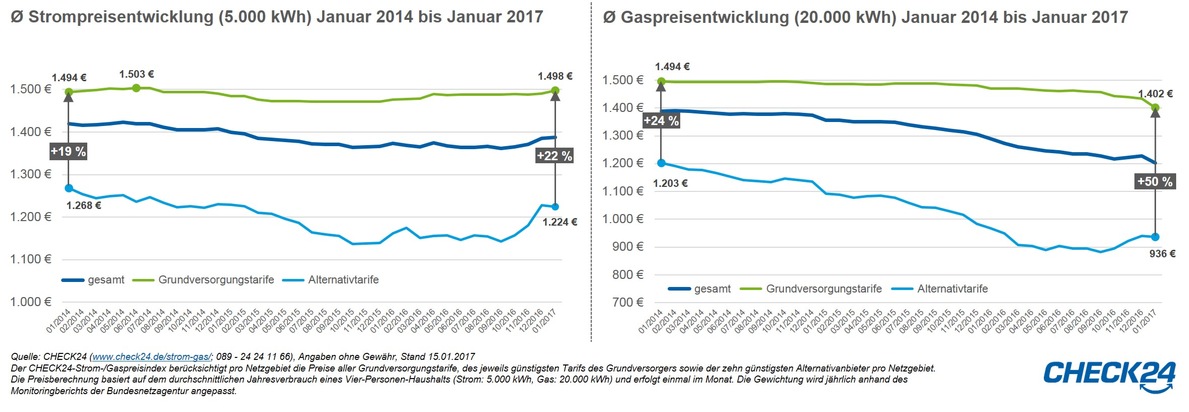 56 der 385 Grundversorger heben ihre Preise zwischen Februar und April 2017 noch an, darunter große Anbieter wie die Stadtwerke München. Ein Wechsel aus der Stromgrundversorgung zu einem Alternativanbieter lohnt sich. Im Schnitt unterscheiden sich die Preise im Januar 2017 um 22 Prozent oder 274 Euro.