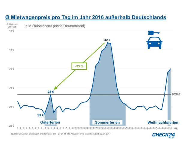 Schnitt für 19 Euro pro TagIn den Osterferien zahlen Urlauber deutlich weniger für ihren Mietwagen als zu anderen beliebten Reisezeiten: In Urlaubsländern kostet ein Leihauto zu Ostern durchschnittlich 28 Euro pro Tag und damit ein Drittel weniger als in den Sommerferien (42 Euro pro Tag).*