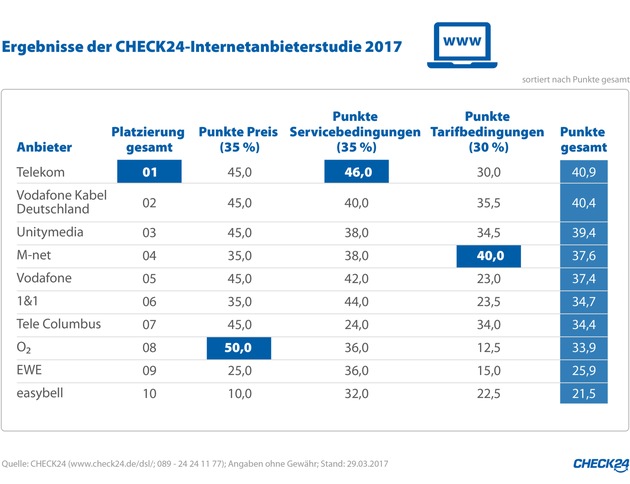 - Regionaler DSL-Anbieter M-net bei Tarifbedingungen SpitzeCHECK24.de hat Doppel-Flatrate-Tarife (Internet und Telefon) von zehn DSL- und Kabelanbietern anhand der Kategorien Preis, Service- und Tarifbedingungen getestet: Die Telekom ist dabei der beste Internetanbieter im Test, knapp gefolgt von den Kabelanbietern Vodafone Kabel Deutschland und Unitymedia auf den Plätzen zwei und drei.1)