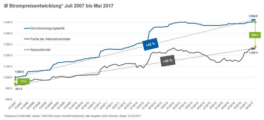 Im gleichen Zeitraum haben die Alternativanbieter ihre Preise um durchschnittlich 35 Prozent angehoben. Dennoch ist das Sparpotenzial durch einen Wechsel nach wie vor groß: Aktuell (Stand Mai 2017) zahlen Kunden der Alternativversorger für 5.000 kWh Strom 1.260 Euro - durchschnittlich 264 Euro weniger als in der Grundversorgung.*
