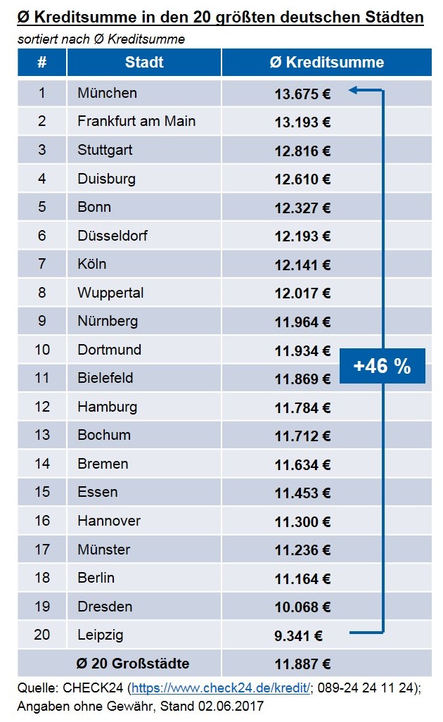 CHECK24-Kunden aus den 20 einwohnerstärksten deutschen Städten haben zwischen Mai 2016 und April 2017 im Schnitt Ratenkredite in Höhe von 11.887 Euro aufgenommen.1) Kreditnehmer aus München leihen sich im Großstadtvergleich die höchsten Summen. Mit einer durchschnittlichen Kreditsumme von 13.675 Euro sind die Darlehen der Münchner 4.334 Euro bzw. 46 Prozent höher als in Leipzig (9.341 Euro). Ein möglicher Grund dafür: Die Kaufkraft ist in der bayrischen Landeshauptstadt höher als in den anderen betrachteten Städten.2)
