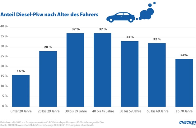 MarkenvergleichBei Fahranfängern und Senioren ist der Anteil von Diesel-Pkw niedriger als in anderen Altersgruppen. Nur 16 Prozent der unter 20-Jährigen haben einen Selbstzünder versichert. Bei den über 70-Jährigen sind es 24 Prozent. Am höchsten ist die Dieselquote der 30- bis 49-Jährigen mit 37 Prozent.*