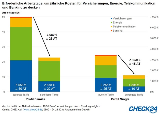 Auch ein Single kann seine jährlichen Ausgaben durch Tarifwechsel mehr als halbieren. Mit der Wahl des jeweils günstigsten Anbieters spart er jedes Jahr bis zu 1.959 Euro und zahlt insgesamt nur noch 1.296 Euro. Zehn statt 25 Arbeitstage reichen aus, um alle Ausgaben für Versicherungen, Energie, Telekommunikation und Banking zu decken.