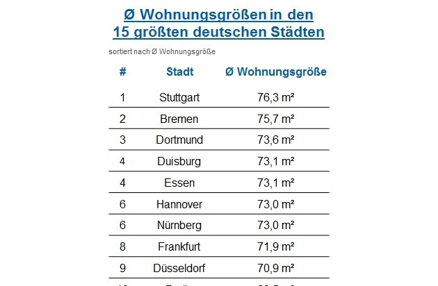 - Je größer der Wohnort desto kleiner die WohnungStuttgarter haben die größten Wohnungen. Im Vergleich der 15 größten deutschen Städte geben CHECK24-Kunden aus Stuttgart bei Abschluss einer Hausratversicherung im Schnitt 20 Prozent mehr Wohnfläche an als Verbraucher aus Dresden: Die Schwaben leben auf 76,3 m², Dresdner nur auf 63,7 m².*