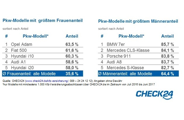 Die mit Abstand beliebteste Automarke ist Volkswagen - fast jeder Fünfte (19 Prozent) fährt ein Modell von VW. Bei Frauen ist der Mini angesagt: Die BMW-Tochter ist die einzige Marke, für die mehr weibliche als männliche Versicherungsnehmer eine Kfz-Versicherung über CHECK24.de abgeschlossen haben (54 Prozent Frauenanteil). Auch Modelle der japanischen Marken Suzuki und Daihatsu sind mit jeweils 46 Prozent überdurchschnittlich beliebt bei Frauen. Typische Männermarken dagegen sind z. B. Lexus oder Jaguar mit jeweils 81 Prozent sowie Porsche mit 80 Prozent männlichen Kfz-Haltern.