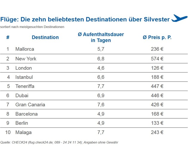 bleiben zu HauseMallorca ist das beliebteste Ziel für eine Flugreise zum Jahreswechsel.*) New York und London sind ebenfalls gefragte Destinationen, um dort auf das neue Jahr anzustoßen - sie folgen auf den Plätzen zwei und drei. Mit Berlin schafft es nur ein deutsches Ziel unter die Top Ten.
