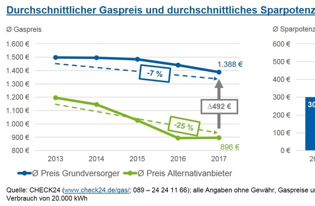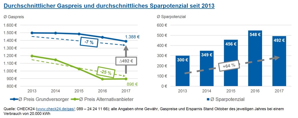Wechsel des Gasanbieters spart 2017 im Durchschnitt 492 Euro