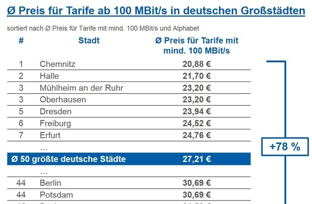 Internettarife ab 100 MBit/s kosten im Schnitt der 50 größten Städte 27 Euro monatlich In 43 der 50 größten deutschen Städte schnelles Internet für durchschnittlich unter 30 Euro Günstigster Tarif mit mindestens 100 MBit/s bereits für 19 Euro pro Monat