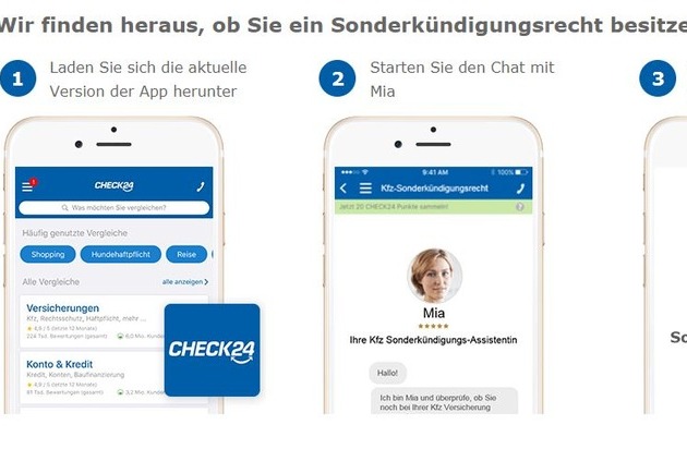 Die chatbasierte Kfz Sonderkündigungs-Assistentin ist in der CHECK24-App integriert und sowohl für iOS als auch Android verfügbar. Der Kunde klärt seine individuelle Situation mit "Mia" und kann ein Foto seiner Beitragsrechnung hochladen. Nach kurzer Zeit informiert "Mia" ihn dann darüber, ob der Vertrag außerordentlich gekündigt werden kann.