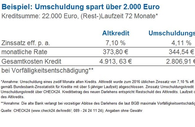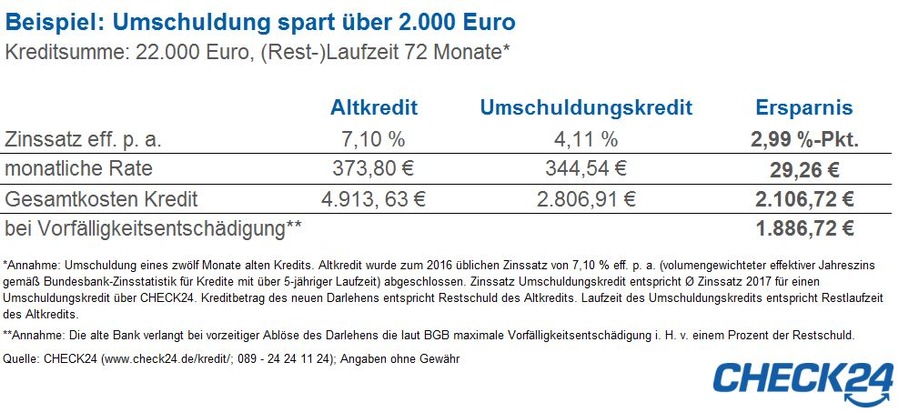 Bei vorzeitiger Ablöse des Altkredits kann der Kreditgeber eine Entschädigung von bis zu einem Prozent der Restschuld verlangen. Selbst dann beträgt die Ersparnis durch die Umschuldung im Beispiel immer noch rund 1.900 Euro.