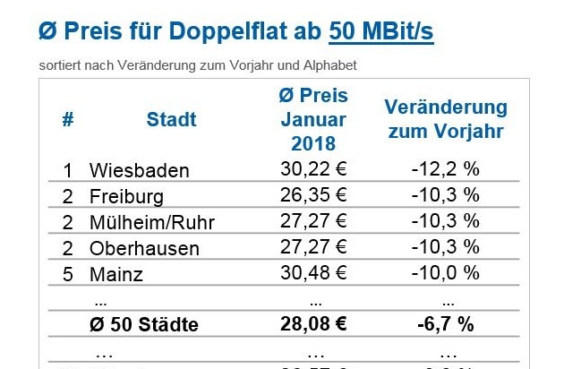 - Stärkster Preisrückgang bei 50 MBit/s in Wiesbaden, schwächster