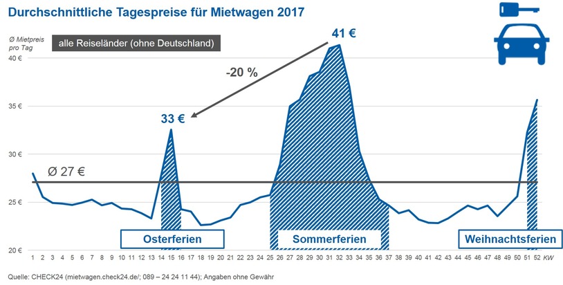 Zu Ferienzeiten steigen die Mietwagenpreise in Reiseländern. Obwohl der maximale Tagespreis in den Osterferien niedriger ist als in den Sommer- und Weihnachtsferien, liegt er fünf Euro über dem Jahresdurchschnitt (27 Euro pro Tag).