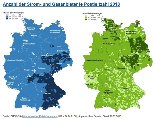 Mio. Euro im JahrVerbraucher wählen je nach Wohnort aus bis zu 227 Strom- und 168 Gasanbietern. Stromkunden haben im Durchschnitt 180 Versorger zur Verfügung. In Teilen von Bayern, Hessen, Thüringen, Sachsen, Sachsen-Anhalt und Brandenburg wählen Verbraucher sogar aus mehr als 200 Stromanbietern.