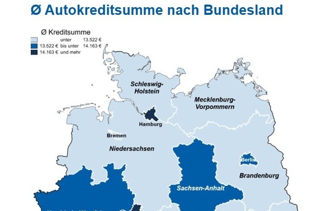 Die höchsten Autokredite nehmen Hamburger mit durchschnittlich 14.805 Euro auf. Auch Bayern, Baden-Württemberger und Hessen leihen sich zur Finanzierung ihres Pkw höhere Summen als der Bundesdurchschnitt.2) Saarländer benötigen für den Autokauf am wenigsten Geld. Mit 12.880 Euro sind die Darlehen 13 Prozent niedriger als in Hamburg.