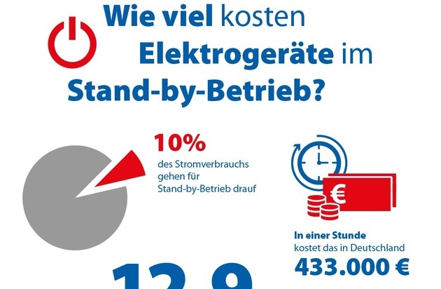 Pro Jahr verschwenden Deutsche etwa 13 Milliarden kWh Strom, um ihre Elektrogeräte im Stand-by-Modus zu betreiben. Das ist mehr als ein mittleres Kernkraftwerk jährlich an Strom erzeugt.2) Entstehende Kosten: rund 3,8 Milliarden Euro.