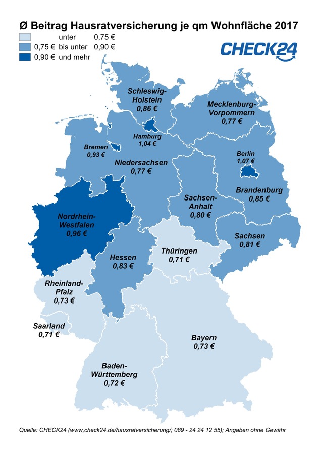 Im Schnitt zahlten CHECK24-Kunden im vergangenen Jahr 0,87 Euro je Quadratmeter Wohnfläche für ihre Hausratversicherung. Mit wenigen Ausnahmen sind die Beiträge im Norden Deutschlands höher als im Süden. Deutlich günstiger ist der Versicherungsschutz z. B. für Verbraucher in Bayern, Rheinland-Pfalz, Baden-Württemberg, dem Saarland und Thüringen. Hier kostete der Quadratmeter nur bis zu 0,73 Euro pro Jahr. Die Einbruchszahlen sind dort deutlich niedriger als z. B. in den Stadtstaaten.