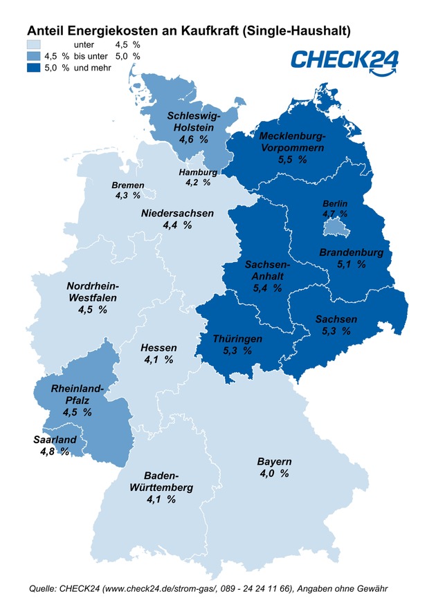 Im Bundesdurchschnitt benötigt ein Einpersonenhaushalt 4,4 Prozent seiner Kaufkraft für Strom und Gas. Die Kaufkraft setzt sich aus dem verfügbaren Nettoeinkommen, Kapitaleinkünften und staatlichen Zahlungen zusammen. 2)