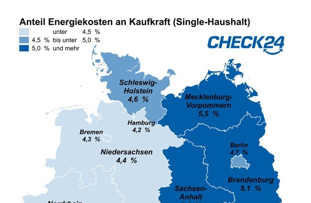 Im Bundesdurchschnitt benötigt ein Einpersonenhaushalt 4,4 Prozent seiner Kaufkraft für Strom und Gas. Die Kaufkraft setzt sich aus dem verfügbaren Nettoeinkommen, Kapitaleinkünften und staatlichen Zahlungen zusammen. 2)