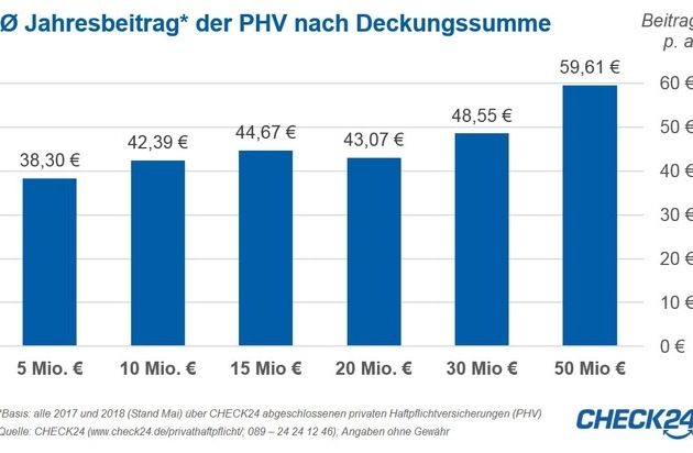 Guter Schutz ist günstig. Für Verträge mit fünf Millionen Euro Deckung zahlten CHECK24-Kunden im betrachteten Zeitraum rund 38 Euro pro Jahr, für die doppelte Summe nur rund vier Euro mehr. Selbst über CHECK24 abgeschlossene Tarife mit 50 Mio. Euro DS kosten im Schnitt weniger als 60 Euro pro Jahr.