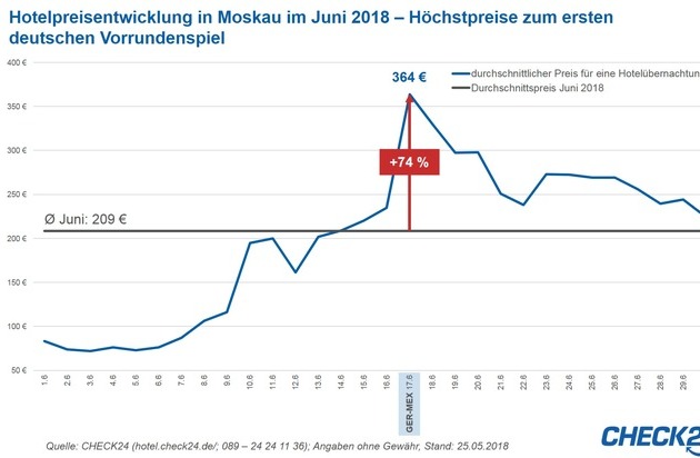 *)allgemeine Suchkriterien: mind. drei Sterne, mind. sieben von zehn Punkte in der Kundenbewertung auf CHECK24, max. fünf Kilometer Luftlinie vom Luzhniki-Stadion in Moskau entfernt. Übernachtungszeitraum während der WM: Sonntag, 15.07.2018 bis Montag, 16.07.2018, Vergleichszeitraum: Sonntag, 05.08.2018 bis Montag, 06.08.2018; Stand der Preise: 23.05.2018; alle genannten Preise gelten pro Nacht für ein Doppelzimmer (ein Zimmer, zwei Erwachsene). Tabellen verfügbar unter: http://ots.de/Jgxuhr