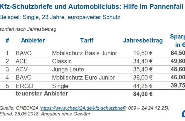 - Individuellen Bedarf prüfen und Leistungen vergleichenEin Kfz-Schutzbrief oder die Mitgliedschaft in einem Automobilclub garantieren Hilfe bei einer Panne oder einem Autounfall. Der Anbietervergleich lohnt sich: Ein junger Fahrer, der sich für europaweiten Schutz entscheidet, spart exemplarisch bis zu 77 Prozent der Beitragskosten. Die Absicherung kostet beim günstigsten Anbieter 19,50 Euro jährlich, beim teuersten 84 Euro.*)
