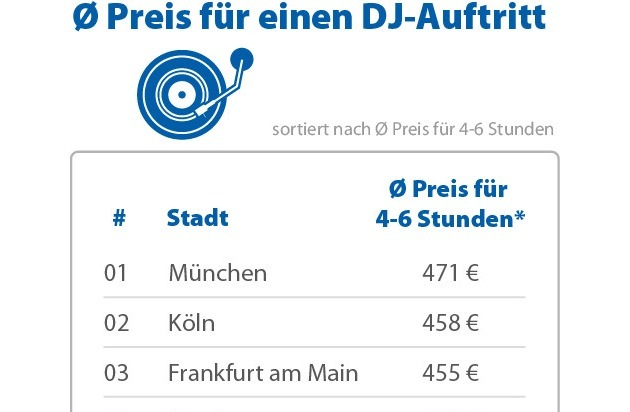 In München sind die Kosten für einen DJ am höchsten. In der bayerischen Landeshauptstadt zahlen Kunden für vier bis sechs Stunden Platten auflegen im Schnitt 471 Euro.*) Das sind 20 Prozent mehr als in Leipzig. Dort ist ein Discjockey mit durchschnittlich 394 Euro am günstigsten.