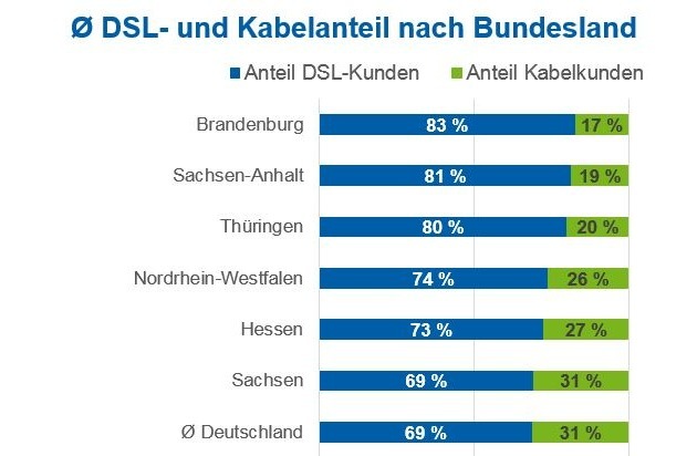 Im Bundesdurchschnitt beträgt der Anteil an DSL-Kunden etwas mehr als zwei Drittel. Den größten Anteil an Kabelkunden haben die beiden Stadtstaaten Berlin und Bremen mit 41 bzw. 42 Prozent.