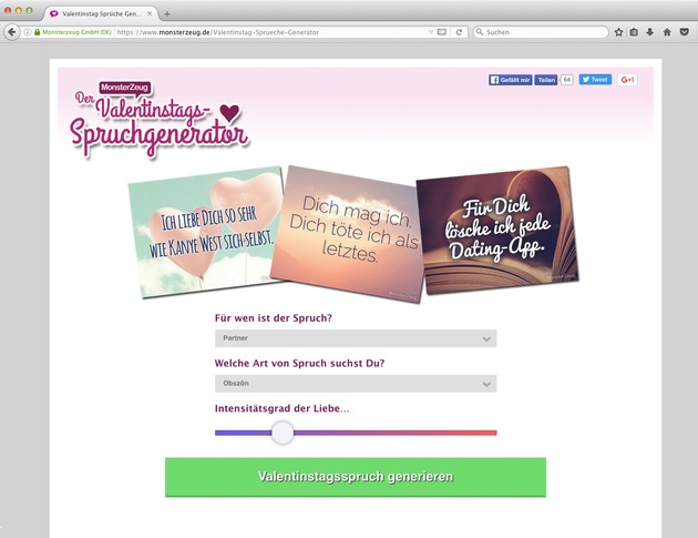 Die Idee zum Valentinstag Sprüche Generator hatte der auf originelle Valentinstag Geschenke spezialisierte Online-Shop Monsterzeug. Dazu Geschäftsführer Dr. Sascha Langner "Zu einem guten Geschenk gehört eine noch bessere Valentinskarte. Bei über 200 einzigartigen Sprüchen findet jeder bei uns einen passenden Spruch für den Partner oder Schwarm".