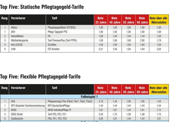 Die Ergebnisse im Einzelnen: Bei den statischen Pflegetarifen kam die Allianz, wie schon im Vorjahr, mit dem Tarif PflegetagegeldBest (PZTB03) mit Endnote 1,0 auf den ersten Platz - in diesem Jahr allerdings punktgleich mit der DKV und ihrem Tarif Pflegetagegeld PTG. Direkt dahinter die Hansemerkur mit ihrem Tarif PA und der immer noch sehr guten Gesamtnote 1,34.