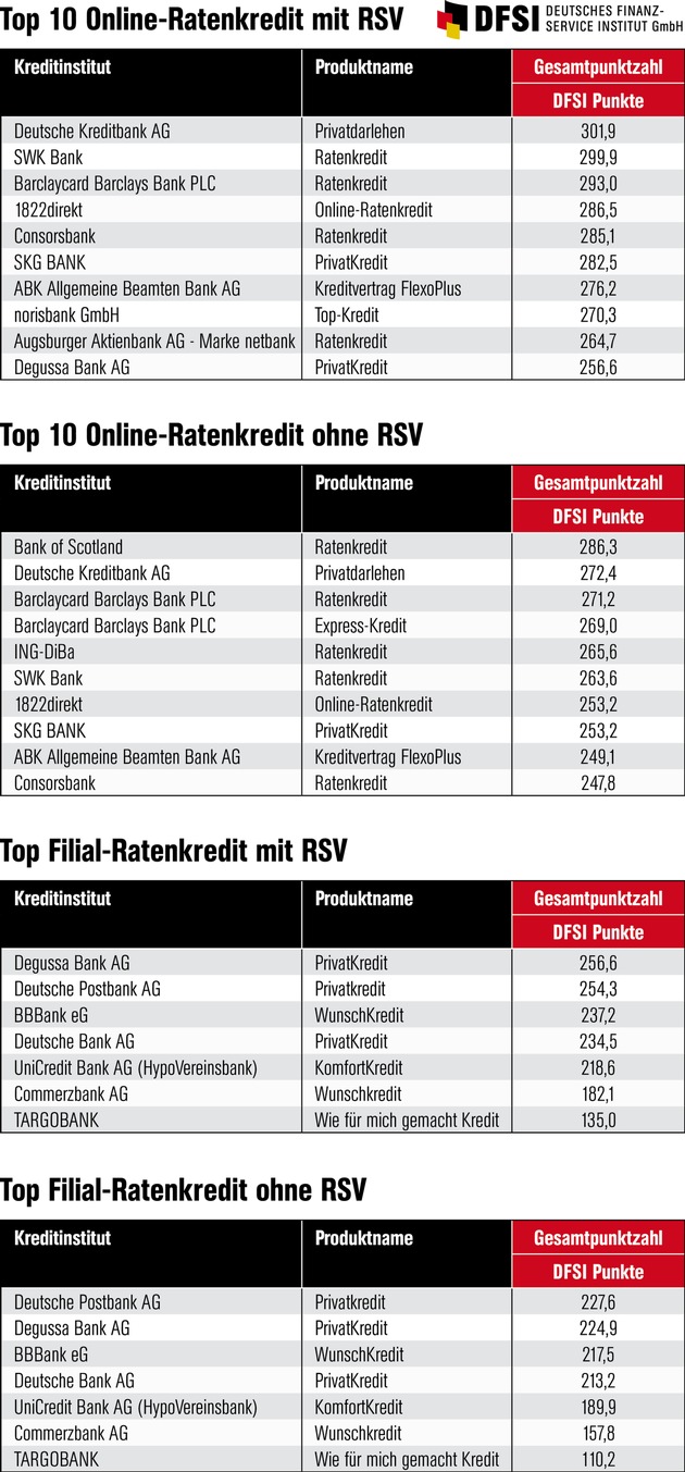 Unterm Strich sind demnach die Konsumentenkredite von Deutscher Kreditbank (DKB), SWK Bank und Barclaycard Barclays Bank die preiswertesten Online-Ratenkredite mit Restschuldversicherung. Ohne diese Absicherung schafften es Produkte von Bank of Scotland sowie wiederum Deutsche Kreditbank (DKB) und Barclaycard Barclays Bank ganz nach vorne. Bei Ratenkrediten, die via Filiale vertrieben werden, schnitten die Produkte von Degussa Bank, Deutsche Postbank und BBBank am besten ab - und das sowohl mit als auch ohne Restschuldversicherung, lediglich die Reihenfolge variiert.