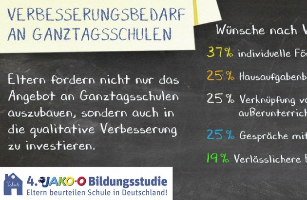 Ein Blick auf die Schulen in diesen Ländern zeigt auch, was sich an vielen der bereits bestehenden Ganztagsschulen in Deutschland noch ändern sollte. Immerhin sehen laut der 4. JAKO-O Bildungsstudie 37 Prozent der Eltern von Ganztagsschülern zum Beispiel deutlichen oder viel Verbesserungsbedarf bei der individuellen Förderung. Jeweils 25 Prozent kritisieren die Hausaufgabenbetreuung sowie die unzureichende Kommunikation zwischen Pädagogen und Eltern als Schwachpunkt. "Es geht also in Deutschland nicht nur darum, die Zahl der Ganztagsschulen weiter massiv zu erhöhen. Nicht weniger wichtig ist es, ihre pädagogische Qualität zu verbessern", sagt Prof. em. Dr. Klaus-Jürgen Tillmann von der Universität Bielefeld, der die JAKO-O Bildungsstudie wissenschaftlich begleitet.