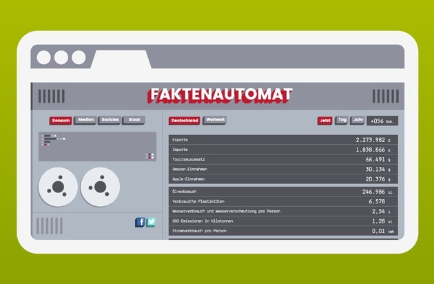 Der Faktenautomat (www.faktenautomat.de) der BAT-Stiftung für Zukunftsfragen, in Zusammenarbeit mit dem Nachrichtenanbieter n-tv, stellt zahlreiche interessante, aber auch nachdenkliche Zahlen, ansprechend dar. Der Faktenautomat ist sowas wie ein Echtzeitzähler: Er zeigt die sekündlichen, täglichen und jährlichen Veränderungen in Deutschland und der Welt in den Kategorien Konsum, Medien, Soziales und Staat. Der Faktenautomat spiegelt auf diese Weise anschaulich die Dynamik unseres Lebens wider und regt zum Nachdenken an.