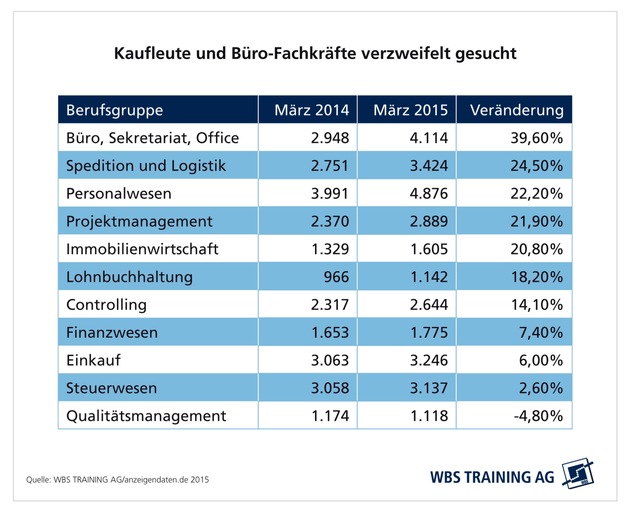Die WBS Training analysiert regelmäßig den deutschen Stellenmarkt zur Weiterentwicklung und Anpassung ihrer Angebote an die Erfordernisse des Arbeitsmarktes und veröffentlicht die Ergebnisse in ihrer Reihe "JobReport". Für die Analyse der kaufmännischen Berufe wurden die Daten aus 197 Stellenbörsen im Internet, in Fachzeitschriften und in Tageszeitungen ausgewertet. Insgesamt waren hier in den Untersuchungszeiträumen März 2015 und März 2014 über 331.000 Stellenangebote ausgeschrieben. Die Daten erhebt WBS Training in Zusammenarbeit mit dem Marktführer der Stellenmarktanalyse index Anzeigendaten.