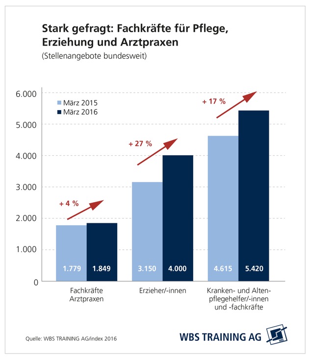 Die Nachfrage nach qualifizierten Fachkräften im Bereich Pflege, Gesundheit und Soziales auf dem Arbeitsmarkt ist unverändert hoch. Die Weiterbildungsspezialisten WBS Training und WBS Schulen haben in einer Untersuchung von Stellenanzeigen im März 2015 und 2016 herausgefunden, dass bundesweit mehr als 14.000 Stellen in diesen Bereichen ausgeschrieben waren. Besonders dramatisch ist die Suche nach Altenpflegehelfern gewachsen: Sie stieg innerhalb eines Jahres um 82 Prozent. Aber auch Altenpfleger (+34 Prozent) und Krankenpflegehelfer (+49 Prozent) waren stark gefragt. Insgesamt gab es im Bereich der Gesundheits-, Kranken- und Altenpflegehilfe im März 2016 5.420 Stellen. Sehr begehrt waren mit 4.000 Angeboten und einem Anstieg von 27 Prozent auch Erzieher und pädagogische Fachkräfte in der Kindertagespflege. Ebenso bewegte sich das Stellenangebot für Fachkräfte, die für einen reibungslosen Ablauf in Arztpraxen sorgen, mit 1.849 Stellen auf einem hohen Niveau. Diese Ergebnisse stellt WBS Training in seiner jüngsten Studie "JobReport Gesundheits-, Pflege- und Sozialberufe" vor.