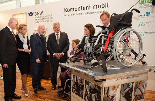 Bundespräsident Joachim Gauck hat sich auf dem Deutschen Fürsorgetag in Leipzig bei der Berufsgenossenschaft für Gesundheitsdienst und Wohlfahrtspflege (BGW) über die sichere Mobilität von Menschen mit Behinderungen informiert. Nach seiner Eröffnungsrede besuchte Gauck bei einem Rundgang den Stand der BGW. Dort erfuhr er, was Menschen mit Behinderungen benötigen, um sicher unterwegs zu sein und am beruflichen wie gesellschaftlichen Leben teilhaben zu können.
