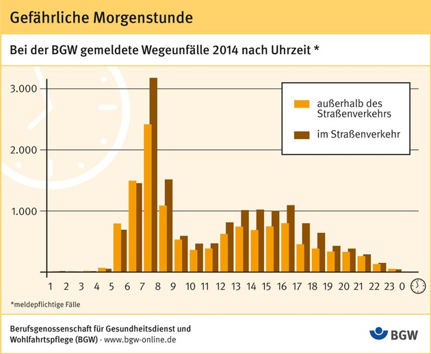 Auch außerhalb des Straßenverkehrs ereigneten sich zwischen sieben und acht am meisten Unfälle zwischen Wohnung und Arbeitsstätte: Gut 2.400 zählte die BGW hier im Jahr 2014, gefolgt von knapp 1.500 zwischen sechs und sieben sowie gut 1.000 zwischen acht und neun Uhr. Berücksichtigt wurden alle Wegeunfälle, die mehr als drei Tage Arbeitsunfähigkeit nach sich zogen.