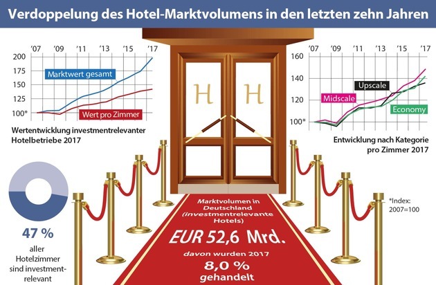 Als investmentrelevantes Angebot wurde von Union Investment und bulwiengesa ein Bestand von rund 375.200 Hotelzimmern ermittelt, die sich auf deutsche Klein-, Mittel- und Großstädte verteilen. Der durchschnittlich ermittelte Wert pro Zimmer lag 2017 bei rund 140.100 Euro. Im Vorjahr lag der entsprechende Wert noch bei 135.600 Euro.