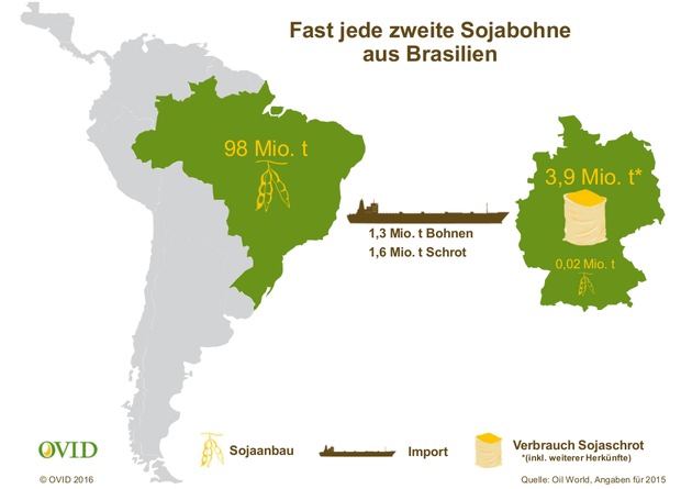 Deutschland importierte 2015 etwa 1,3 Millionen Tonnen Sojabohnen und 1,6 Millionen Tonnen Sojaschrot aus Brasilien. Insgesamt ernteten die Brasilianer im letzten Jahr etwa 98 Millionen Tonnen Soja. Mit 40,1 Millionen Tonnen ging der größte Teil davon nach China.