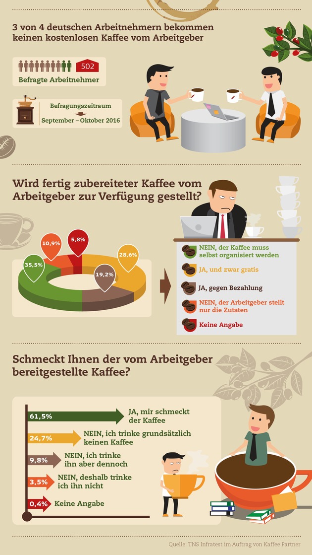Eine Studie von Kaffee Partner zeigt: 3 von 4 deutschen Arbeitnehmern bekommen keinen kostenlosen Kaffee vom Arbeitgeber