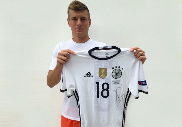 Toni Kroos stellt mit seinem Trikot aus dem EM-Halbfinale gegen Frankreich ein einzigartiges Andenken an den Fußballsommer 2016 zur Verfügung. Seit Freitag versteigert United Charity, Deutschlands größtes Charity-Auktionsportal, das getragene Trikot des Nationalspielers zugunsten seiner Stiftung.