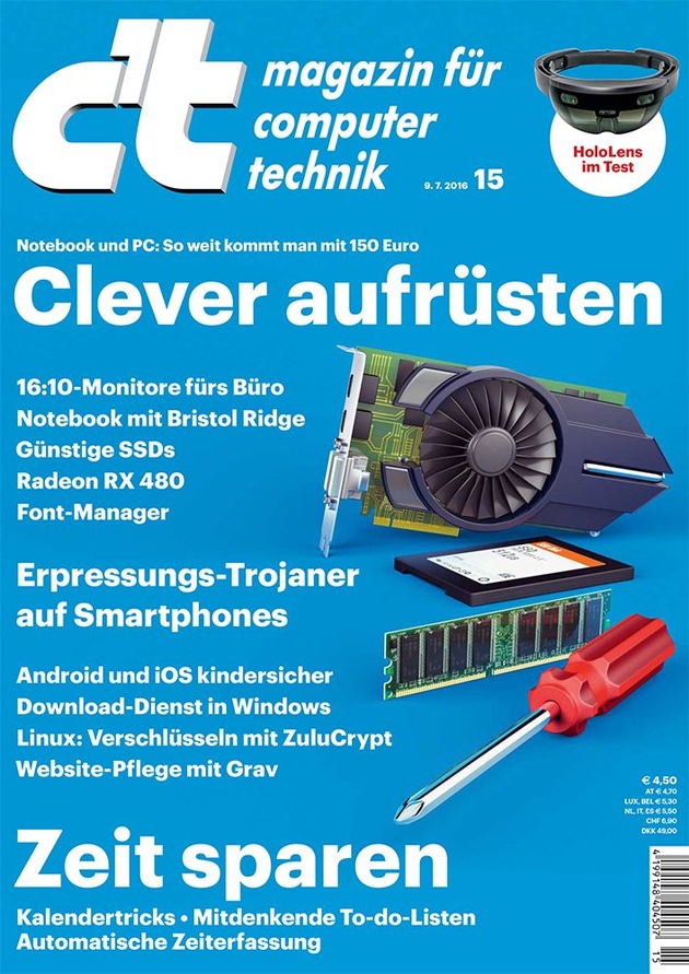 Das Computermagazin c't erscheint 14-täglich und ist für 4,50 Euro im gut sortierten Zeitschriftenhandel sowie unter www.heise-shop.de erhältlich.
