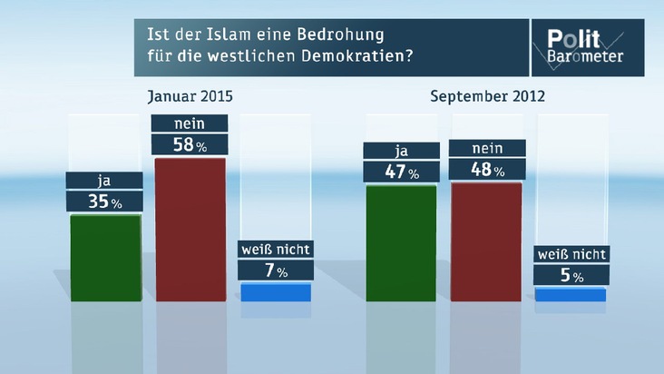 Mit 58 Prozent sind die meisten Deutschen der Ansicht, dass vom Islam keine Bedrohung für die Demokratie bei uns ausgeht (glaube das: 35 Prozent). Diese Einschätzung wird von den Anhängern aller Parteien mehrheitlich geteilt, mit Ausnahme der AfD-Anhänger, von denen gut zwei Drittel (69 Prozent) im Islam eine solche Gefahr sehen. Im September 2012 herrschte in dieser Frage insgesamt ein zwiespältiges Meinungsbild, für 47 Prozent stellte der Islam damals eine Bedrohung der westlichen Demokratien dar, für 48 Prozent nicht.