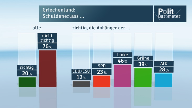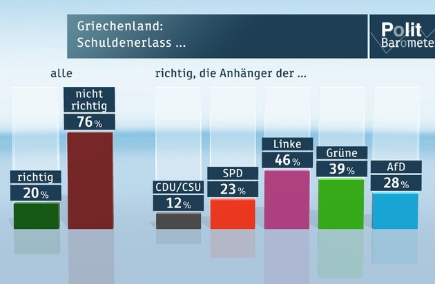 Auch nach der Parlamentswahl in Griechenland ist eine Mehrheit dafür, dass das Land im Euro-Raum bleibt. Fast genau wie vor zwei Wochen finden 54 Prozent (Jan. I: 55 Prozent), Griechenland solle den Euro als Währung behalten, 36 Prozent (Jan. I: 33 Prozent) sind dagegen (Rest zu 100 Prozent hier und im Folgenden jeweils "weiß nicht"). Den Forderungen der neuen griechischen Regierung nach einem Schuldenerlass stehen die meisten Befragten jedoch ablehnend gegenüber, genauso einer Aufweichung der mit der EU vereinbarten Sparvorgaben. So wollen 79 Prozent und klare Mehrheiten in allen Parteianhängergruppen, dass es bei den festgelegten Sparvorgaben bleibt, lediglich 13 Prozent meinen, diese sollten gelockert werden. Einen Schuldenerlass für Griechenland befürworten nur 20 Prozent, gut drei Viertel (76 Prozent) finden dies nicht richtig, darunter vor allem die Anhänger von Union (84 Prozent), SPD (73 Prozent) und AfD (69 Prozent), aber auch bei den Anhängern der Grünen (59 Prozent) und der Linken (52 Prozent) überwiegt die Ablehnung.