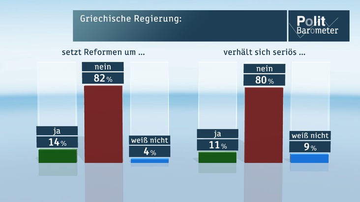 Nur gut jeder Zehnte (11 Prozent) meint, dass sich die griechische Regierung gegenüber den europäischen Partnern seriös verhält. Eine deutliche Mehrheit von 80 Prozent sieht das nicht so. Auch glauben nur 14 Prozent, dass die griechische Regierung die von ihr angekündigten Sparmaßnahmen und Reformen auch wirklich umsetzen wird, 82 Prozent bezweifeln das.